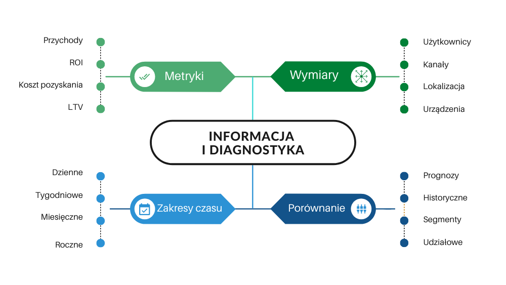 • Wymiary: np.: użytkownicy, kanały, lokalizacje, urządzenia, typy działań